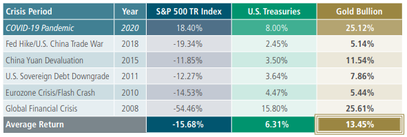 Gli investitori cercano l’oro per la sua qualità di bene rifugio durante i periodi di instabilità economica e politica. Durante l’apice della crisi pandemica Covid-19, l’oro ha sovraperformato sia le azioni che le obbligazioni. Secondo il World Gold Council, la performance dell’oro durante i periodi di crisi è aumentata fino a diventare il “motivo principale per le banche centrali di detenere oro”, come si denota dal grafico: