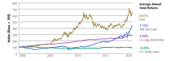 L’oro ha sovraperformato le principali classi di attività negli ultimi 20 anni, migliorando storicamente i rendimenti e accrescendo la diversificazione, come si vede dal seguente grafico: