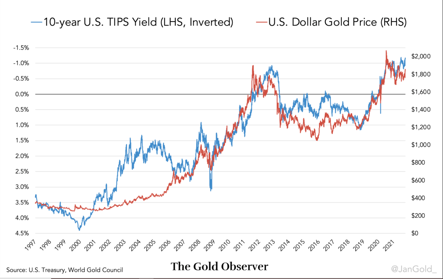 Osservando infatti la serie storica qui di seguito, vediamo come dal 2006 il prezzo dell’oro in dollari USA è inversamente correlato ai tassi di interesse reali (attesi) derivati ​​dal Treasury Inflation Protected Security (TIPS) statunitense a 10 anni: