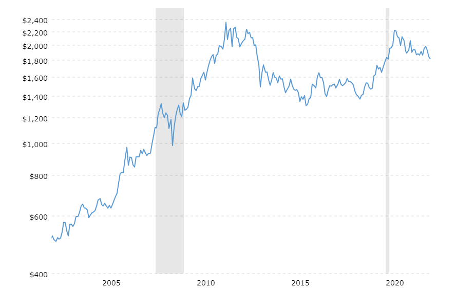 Analizzando l’orizzonte temporale del prezzo dell’oro sugli ultimi 20 anni notiamo come il trend sia progressivamente aumentato nel tempo.